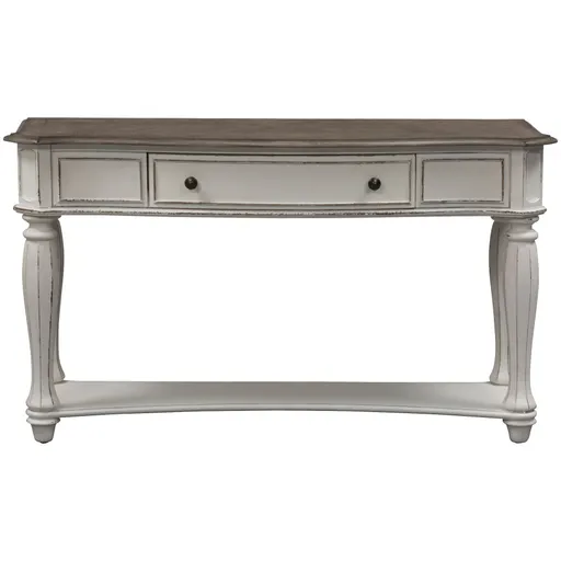 The Magnolia Manor sofa table is crafted in the grand European tradition. Classic design and artistic distressing give this console table a shabby chic elegance that never goes out of style. Created with round pilasters and canted corners, it's a showpiece you can place in your entryway, behind the sofa, or against any high-profile wall. The drawer features French and English dovetail construction, full-extension drawer glides and antiqued knobs. Made of poplar solids and white oak and birch veneers, this accent table has an authentic heirloom look and feel.
