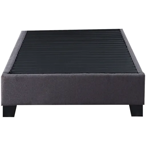 The Modern bed frame takes the place of both a metal frame and a box spring/foundation. Handsomely styled, it's fully upholstered, so no need to cover it up with a bed skirt—and no hard edges to worry about. Quick and easy to assemble, this durable foundation has drop-in rails, a Velcro-attached slat roll, and a clip-in center support with legs.