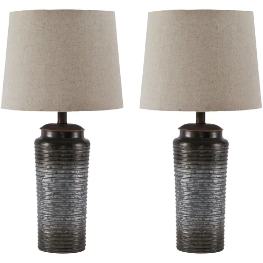 This set of 2 Norbert table lamps makes a brash statement. Made of textured galvanized metal, each lamp features a horizontal ribbed design that complements modern industrial design to country rustic. And with a 3-way switch, they're perfect for anything from soft ambient lighting to plentiful reading light. Topped with a fabric hardback shade. Requires 150-watt maximum bulb (25-watt CFL).