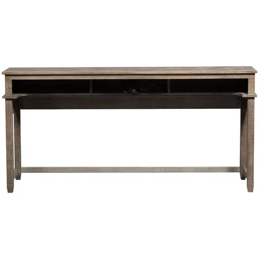Bring rustic warmth to your home with the Parkland Falls console bar table. Perfect for transitional, modern farmhouse, or industrial décor, the design features a herringbone plank top finished with heavy distressing for a weathered look. Turn it one way, it's a great multi-level display table with power and USB charging. Turn it around, and it serves as a bar-height workstation, ideal for setting behind a couch. The shelf underneath the workstation stores books or a laptop out of sight when you're not using them. Pair it with the Parkland Falls Console Stools for a great desk alternative or multifunction eating area.