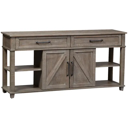 Bring rustic warmth to your décor with the Parkland Falls sofa table. The barn-door-inspired design features a herringbone plank top finished with heavy distressing for a weathered look. Ideal for use as a TV console or storage behind a sofa, it has two drawers with dovetail construction, full-extension glides, and pewter-toned bar pulls, plus storage with sliding doors that can cover either the center cabinet or exterior open shelves. The center shelves are adjustable, and the back of the cabinet has cutouts for cable management. Perfect for transitional, modern farmhouse, or industrial décor, this sofa table coordinates with the other pieces in the Parkland Falls collection for a cohesive look.