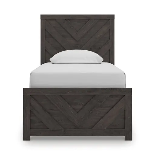 Designed with everyday style in mind, this twin panel bed is a simply chic approach to modern living. A dark charcoal finish blends black and brown undertones, creating a versatile look that effortlessly pairs with your existing pieces. And for an extra dash of trend-right style, the headboard is dressed in a playful chevron pattern.