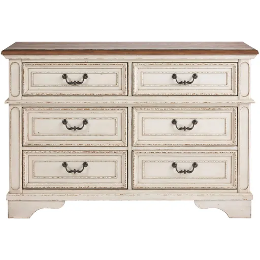 The Realyn dresser keeps the look of French provincial going strong. With its distressed detailing, this 7 drawer bedroom dresser has an antiqued look that epitomizes shabby chic. All the classic elements are in place: framed drawer fronts, decorative corbels, and bronzed bail drawer pulls. Quality construction details include dovetail drawer construction with smooth, ball bearing glides. Realyn is made of veneers, wood, and engineered wood. Add the matching mirror for a finished look.