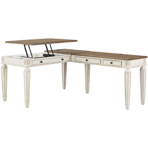 Elevating the art of traditional cottage styling, this L-shaped desk is your heavenly home office realized. Two-tone finish combines chipped white with distressed wood tone tops for added charm. Framed drawer fronts, decorative corbels and elegantly turned and tapered legs add refinement, while dark bronze-tone knobs lend a classic touch. Spring lift top raises the surface to a comfortable standing position, for a healthy alternative. Built for looks and productivity, the built-in power supply and dual USB ports keep your devices close at hand and ready to go.