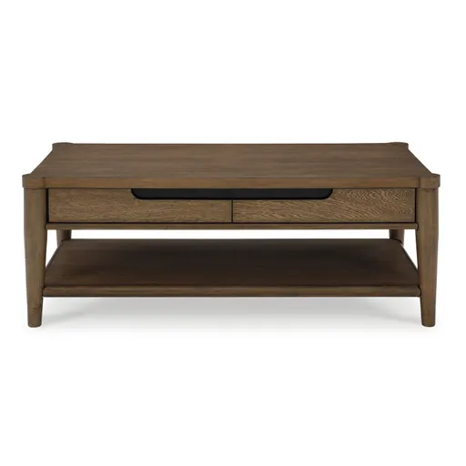 Elevate your modern or mid-century living room with this stylish coffee table. It combines sophistication and functionality, allowing you to showcase decorative items on an open shelf and conveniently store gaming controllers and remotes in the spacious drawers. Imagine entertaining guests with this gorgeous table, adding a touch of minimalism with big character to your home.