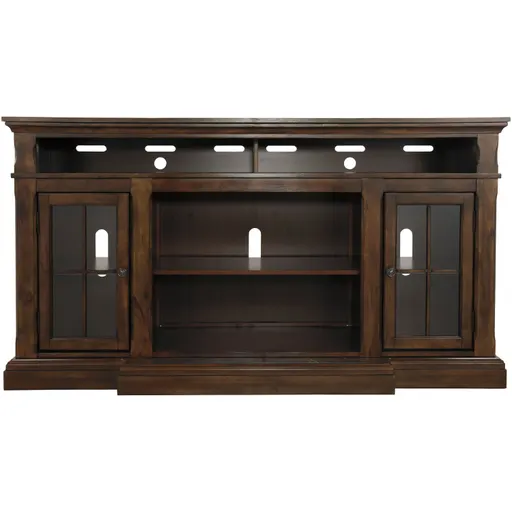The beauty of this TV stand will immediately engage you. The slight breakfront shape is a rare find and an ideal fit among traditional and eclectic tastes. Soft black undertones highlight the warm finish. Multiple cubbies and glass-door enclosed shelves organize your audio/video components and plenty of extras. Sold separately, an electric fireplace fits neatly in the center cubby.