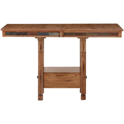 Regular or counter height? The Sedona adjustable height table lets you decide. Plus, it has a self-storing 12-inch leaf for even greater versatility. Made of mindi solids and veneers, the highlight of this table is genuine slate trim all around. Traditional in inspiration, but modern in interpretation, this rectangular table has a casual attitude that's perfect for everyday dining or special occasions.