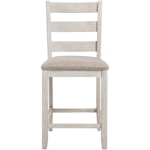 This upholstered bar stool invites you to raise the bar on small space living. An inspired choice for coastal chic or modern farmhouse settings, this comfortably cushioned bar stool with classic ladderback styling sports a Gray/Silver white finish with rub through effect for timeworn appeal.