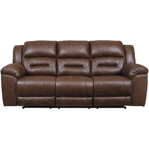 For those that love the cool look of leather but long for the warm feel of fabric, this power reclining sofa delivers both with ease. Its high-performance padded faux leather is remarkably durable and easy to clean, just the thing for family spaces. When it's time to relax, the one-touch power control puts the perfect position at your fingertips. Channel-stitched back cushions provide indulgent lumbar support for maximum seating comfort—not to mention fashion-forward flair.