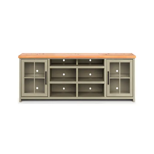 Designed and made in the US, the spacious Vineyard 88 Inch Console gives you ten storage areas to store your media gear, while the stylish two-toned finish Sage Green finish with Fruitwood top brings a new look to any room. This spacious console easily holds up to a 102-inch TV and features cutouts that make cable management a breeze. The oil-rubbed hardware and glass panel doors make a stunning statement in your living room. Its casual, coastal vibes work well with a number of design styles, including cottage core, farmhouse, and transitional. Sit back, relax and love your transformed home with the Vineyard 88 Inch Console.