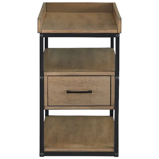 The Vintage Chairside Table by Progressive Furniture is a cool, industrial accent table with a sienna finish. The tray-like surface puts one in the mind of an office from another era. Below are two shelves and a handy drawer to help you hide clutter and store items. This piece can be either a modern end table or an antique end table, depending on the decor of the room. The solid construction means that this chairside table will be with you for years to come. You can find the Vintage Side Table at Slumberland Furniture or order yours to be delivered to your home today.