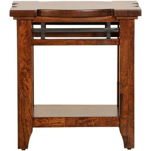 The Whistler Retreat chairside table emphasizes the beauty of rich wood grain in an updated style. Built from certified sustainably grown solid mango wood and mango veneers, with corner blocked construction throughout for strength. Finished with a 17-step process which includes hand sanding and hand rubbing to maximize grain quality and uniqueness in each piece. This chairside table references traditional style elements and modernizes them with clean lines and powder-coated metal accents. One lower shelf is perfect for books, décor items, or whatever you want tucked away but easily accessible. Coordinates with the rest of the Whistler Retreat collection.