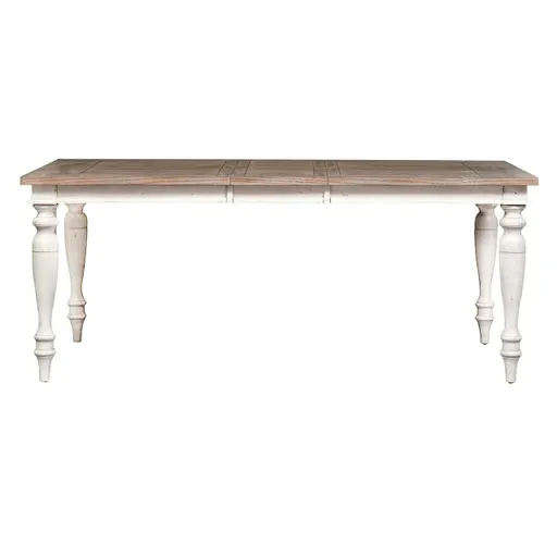 Gather around the Whitney Rec leg Dining. Crafted of rubberwood solids and oak veneers, this piece features an English country charm, one 12" leaf to accommodate guests or a larger family, planked top, and is anchored by heavily turned legs. The antique linen and weathered gray finish gives this group an heirloom appeal.