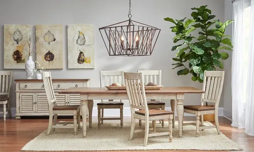 Embrace timeless elegance with the Belmont Antique Linen 5-Piece Dining Set. Crafted from robust Sengon Tekik hardwoods and finished in timbered brown and antique linen, this set offers durability, style, and comfort for any dining occasion.