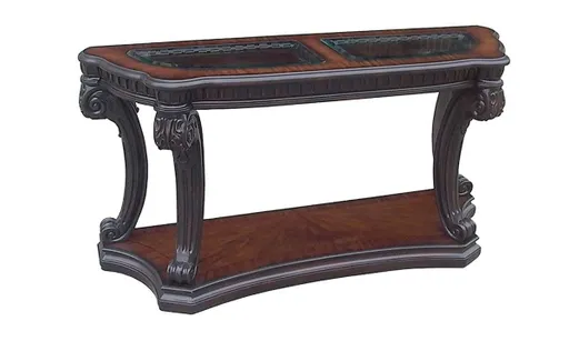 Traditional pedestal table with glass inserts in a rich brown finish. Shop online for more sofa tables that would look great in your living room.