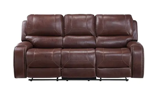 Spacious 86-inch double reclining sofa includes a drop-down table with cupholders, storage and pop-up power outlets and USB charging ports and features warm brown leather-look upholstery.