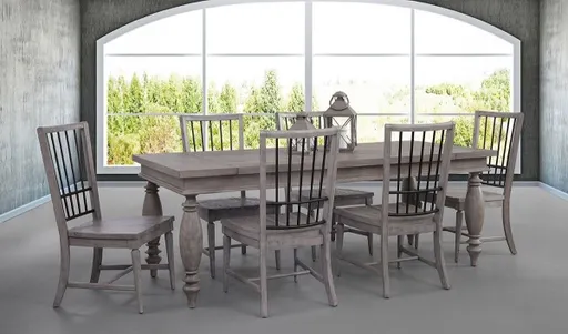 Modernized by a plank-effect tabletop and fieldstone grey finish, this set is perfect for any dining area. Includes flip top storage on both ends of the table and elegant spindle-back chairs for functionality and style.