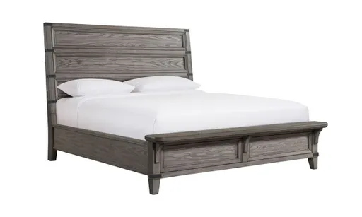 Industrial queen-size panel bed includes built-in USB charging ports and a footboard bench, and features a contemporary wire brushed gray finish.