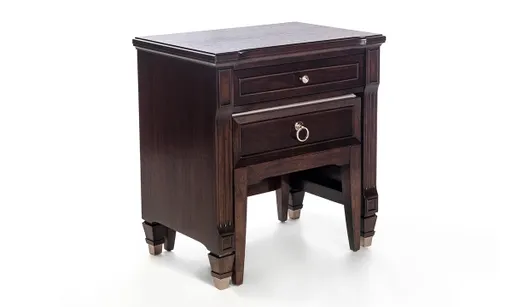 Ingenious two-piece vanity nightstand features a traditional silhouette and carved details. Includes two built-in USB charging ports and velvet-lined drawer bed.