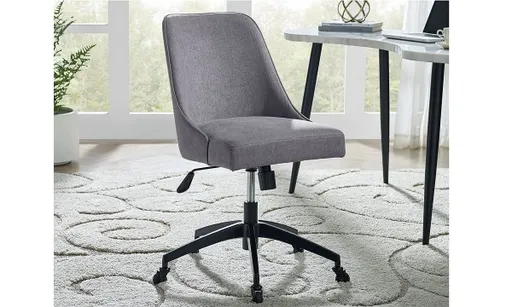 Multi-functional gray fabric upholstered desk chair features a sleek and chic profile and sturdy rolling base with swivel motion and adjustable tilt and height settings.