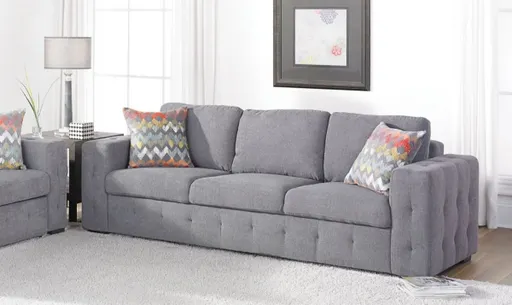 98-inch track arm sofa features a sculptural silhouette and stylish tufted detailing in soft gray upholstery. Shop more sofa and living room furniture deals online now or at a furniture store near you!