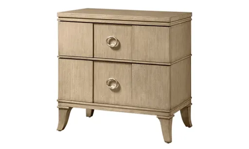 The Verona Taupe 2-Drawer Nightstand is a practical and elegant addition to any bedroom. Measuring 28"W x 18"D x 28 1/4"H, it offers ample storage with smooth-gliding drawers on ball bearing guides. Constructed from hardwood solids and veneers, this nightstand is both durable and stylish. The oversized custom hardware adds a touch of modern sophistication to this functional piece.