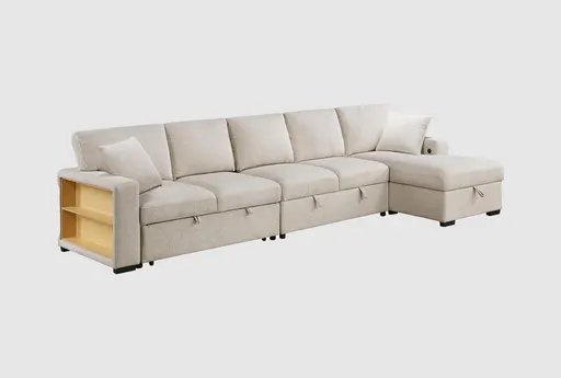 $1,175.00Living Spacesdimitri beige boucle fabric 144" 3 piece convertible futon sleeper sectional with right storage chaise drop down cup-holders & usbSaveAdd to List