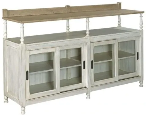 The American Drew® Litchfield Dorset Driftwood Credenza that has storage inside the sliding door with seeded glass, adjustable wood shelf and cord exits. Perfect complement to any dining area or storage piece for any room.