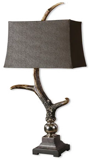 Finished in a burnished bone ivory, this staghorn buffet lamp also features a crackled wood tone base. Accented with cast aluminum and topped with a rectangular semi drum shade in a suede chocolate textile. Use this in a focal area of your home, like a front entryway table or somewhere that needs a little something to finish the look.