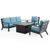 Experience the oversized comfort and structural strength of our exclusive Montecito Collection, featuring a handmade aluminum frame with a durable multi-step powder-coated and oven-baked clear coat finish. Each piece in this 4 piece sofa group with a fire pit is built by laser welding to create fully welded and braced frames with zero weld marks. The sofa and club chairs feature PVC sling seat suspenion and include oversized deluxe Sunbrella® acrylic cushions. The textilene material's flexibility and sturdiness make it a comfortable material for seating.