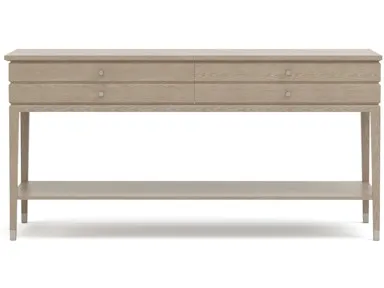 The Maidstone Two-Drawer Server echoes the Round Pedestal Table's carved-away details. Sitting side by side, two side-hung, center-guided drawers feature a stacked chamfer design and hexagonal knobs of warm nickel; the right-hand drawer contains a silverware tray.