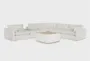 Introducing the Getaway White 6 Piece Modular Sectional with Console & Table Cocktail Ottoman, designed for modern living spaces. This symmetrical sectional features a sleek, white fabric that complements any contemporary decor. Crafted from 100% polyester, it offers durability and comfort, making it perfect for family rooms and great rooms alike.