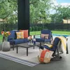 The Portofino Collection features a bold and modern look that is built for long-lasting durability and will provide you with the perfect backyard patio experience. Each item in this 4 piece swivel loveseat set has a fully welded, handmade extruded aluminum frame with weather-resistant properties such as a polyester powder-coated finish with an oven-baked clear coat. The loveseat and swivel club chairs feature a handwoven full round synthetic resin wicker seat and back paired with deluxe solution-dyed acrylic Sunbrella® cushions to create a relaxed and comfortable experience. The coffee table features an extruded aluminum slat top design with tapered and angled legs, keeping your refreshments and snacks nearby.
