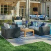 The Laguna Collection is a casual contemporary outdoor patio collection with a tightly woven, wicker design, for a transitional look that won't go out of style. The 4 piece swivel loveseat group offers a blend of materials consisting of wicker and teak that adds warmth and substance to your space. The loveseat and swivel gliders are handwoven with 8mm full round PE synthetic strands of resin wicker, treated with UV inhibitors, over a fully welded, handmade aluminum frame with a multi-step powder-coated finish and supported inner walls. They are resort sized and feature textilene seat suspension. The textilene material's flexibility and sturdiness make it a comfortable material for seating. The Mandalay coffee table is composed of solid teak and has a fine, sanded finish with an natural-based stain. It is a combination of machine-made for precision and handmade with traditional Mortise and Tenon construction for smooth and tight joinery.
