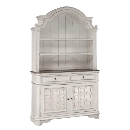 Display your china with the perfect blend of European design with the Magnolia Manor hutch and buffet. Crafted of poplar solids with white oak and birch veneers, this piece features two fully stained full extension drawers with felt lining for easy access to storage, two antiqued mirrored doors with a decorative grid panel that can be removed to reveal a wood panel, and touch lighting that illuminates the piece, accented by antique pewter knob hardware. The buffet top features a weathered brown finish accented by whitewash, canted corners, and bead molding. Storage abounds with one adjustable shelf located behind each door in the buffet, two adjustable wood framed glass shelves in the hutch and the wood framed drawers. The arched shape hutch features a planked back panel outlined by dog bone accents, anchored by rounded pilasters and bracket feet. Warm antique finishes and artistic distressing along with grand scale a group to be passed to generations.