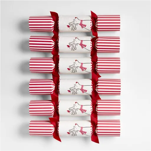 Liven up your holiday entertaining with these fun party favors. Wrapped in red-and-white paper featuring Joan Anderson's signature reindeer, each cracker contains hidden treasures. To access the concealed cache, pull the cracker on either end until it breaks open with a pop to reveal a festive ornament, gold crown and a conversation card.