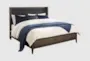 Introducing the Beckham California King Wingback Shelter Storage Platform Bed. This modern bedroom centerpiece features a chic wingback design and is upholstered in Wild Oats fabric, providing both style and comfort. Crafted from durable materials including mahogany wood, it offers practical storage solutions with built-in drawers.
