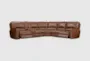 Introducing the Soren Saddle Brown Natural Leather 132" 6 Piece Power Reclining Modular Sectional, designed to bring comfort and style to your living room. This rustic sectional features a reversible orientation and is upholstered in top grain leather with match, ensuring durability and a luxurious feel. The sectional includes power headrests, adjustable headrests, and USB ports for added convenience.