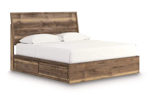 Nostalgic style, retooled for today’s trends. This king panel bed with storage puts an elevated twist on mod aesthetics. Its warm brown tones reflect the mid-century vibes you love, while the simple panel design incorporates contemporary motifs. Ultra-spacious storage in the footboard keeps clutter out of sight. Integrated drawer handles round out the look in sleek style. With this bed, you can build your bedroom into a modern haven with a touch of retro-cool flair.