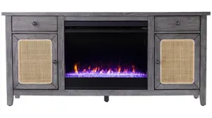 Raegan Fireplace Media Console warm up your modern farmhouse design with this fireplace media stand. Spacious cabinets neatly tuck away movies, games, and blankets, while two drawers store remotes and gaming accessories. Shimmering faux crystal adds ambiance with flickering LED flames, alternating colors, and lifelike embers, creating a warm fireplace feel in any season. Create a cozy space to host the big game or binge your favorite shows with this fireplace entertainment center in your living area or game room.