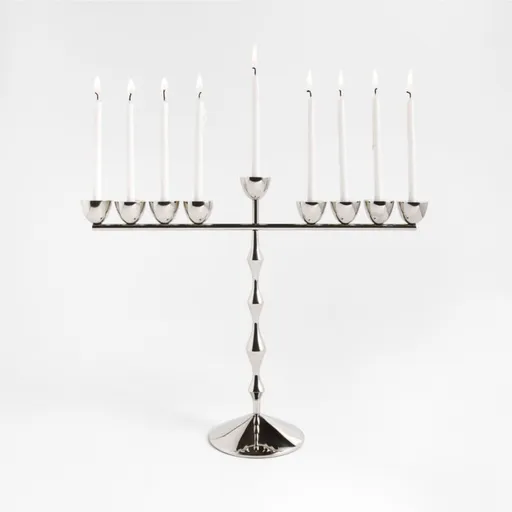 Our Beaded menorah is modern and sculptural with understated, jewelry-inspired lines. Made of cast brass with a gleaming nickel finish, the graceful candelabra alternates tapered shapes on the stem, giving it the look of strung beads. Two arms extend out horizontally, each with four candle cups.