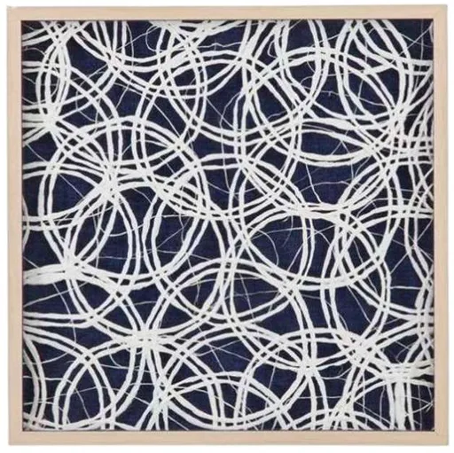 Selective Wall Art is a shadow box accentuated with a dark blue matt and a circular pattern of woven rice paper with a natural blonde molding. This piece of art is hand-painted by a skilled artist lending itself to a unique technique and will vary slightly.