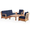 Our Teak Two 4 piece sofa group with cushions from the Castello deep seating collection has a modern look that adds both charm and convenience to your space. Each item in this group is solid teak and has a fine, sanded finish for less long-term maintenance as you enjoy it for years to come. The features of the Castello coffee table contain a wide-set frame with a clean, straight constructed form. The back frame of the sofa and club chairs consist of horizontal slats and the arms are constructed in a boxy manner. In addition, the seating contains a wide-set bottom frame, creating a more elevated seating appearance. The teak used is plantation grown, European grade teak furniture from FSC-certified upcycled teak wood, gathered from old-growth, FSC-certified forests, across the Indonesian archipelago. The teak wood undergoes a six-week kiln drying process of taking moisture out of the wood. This is important because the moisture in the teak wood is what causes the finished product to shrink or expand with changes in temperature and humidity. Making it one of the most durable materials we carry, teak is the only material with a natural resistance to water, insects, mold, and mildew. Each piece is a combination of machine-made for precision and handmade with traditional Mortise and Tenon construction for smooth and tight joinery to showcase the elements from local artisans.