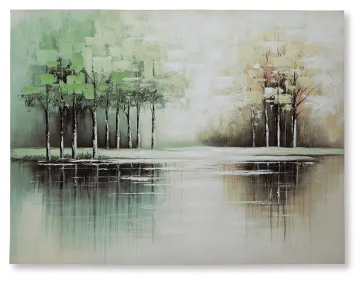 This wall art incorporates a touch of serene style into your decor. Trees are reflected in the rippling water of the foreground, crafting a peaceful landscape you’ll love to get lost in. With its green, tan and white hues, it’s a welcome addition to contemporary interiors.