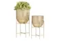 Enhance your living space with the 6" 5" Gold Metal Indoor Outdoor Planter with Removable Stand Set of 2. These planters are designed with sleek elegance and clean lines, offering a minimalistic touch of luxury. Perfect for both indoor and outdoor use, they bring a sophisticated satin gold finish to any environment.