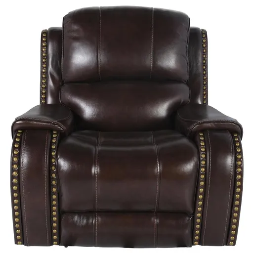 Kick back and relax on the Durham Brown Leather Power Recliner. This traditional style recliner features power headrest, built-in USB ports, track arms and deep, wide seating. One hundred percent leather where the body touches, this impressive piece is styled with antique bronze nail head accents, a black metal base and contrast stitching.