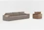 The Amallo Mocha Brown Fabric 151" 3 Piece Sofa and Alicia Saddle Brown Vegan Faux Leather 40" Swivel Chair set is a perfect addition to any modern living room. The mellow mocha fabric sofa offers a soft and comfortable seating experience, while the saddle brown faux leather swivel chair adds a touch of versatility and style. Both pieces feature a contemporary design that complements a variety of decor styles.