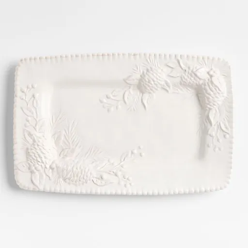Embossed with winter botanicals, our ceramic plate graces holiday spreads with vintage charm and sculptural dimension. Glazed by hand in antique white, the rectangular plate showcases a beaded border and textured swags of pine cones, berry sprigs and pine tree sprays.