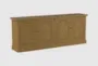 The Katherine Sideboard is a 90" traditional wood server with storage, doors, adjustable shelves, and side metal glides, perfect for any dining room. This rustic smoke brown server includes a storage door, adjustable shelves, English dovetail drawers with self-closing glides, and is made from pine, mahogany, albacia, MDF and plywood.