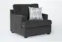 The Colby Smoke Grey Fabric Arm Chair is the perfect addition to your living room, offering a blend of comfort and style. Upholstered in a rich Madigan Smoke color, its track arms and tapered legs provide a modern look that complements any decor. Made from 100% polyester, this club chair ensures durability and ease of maintenance.